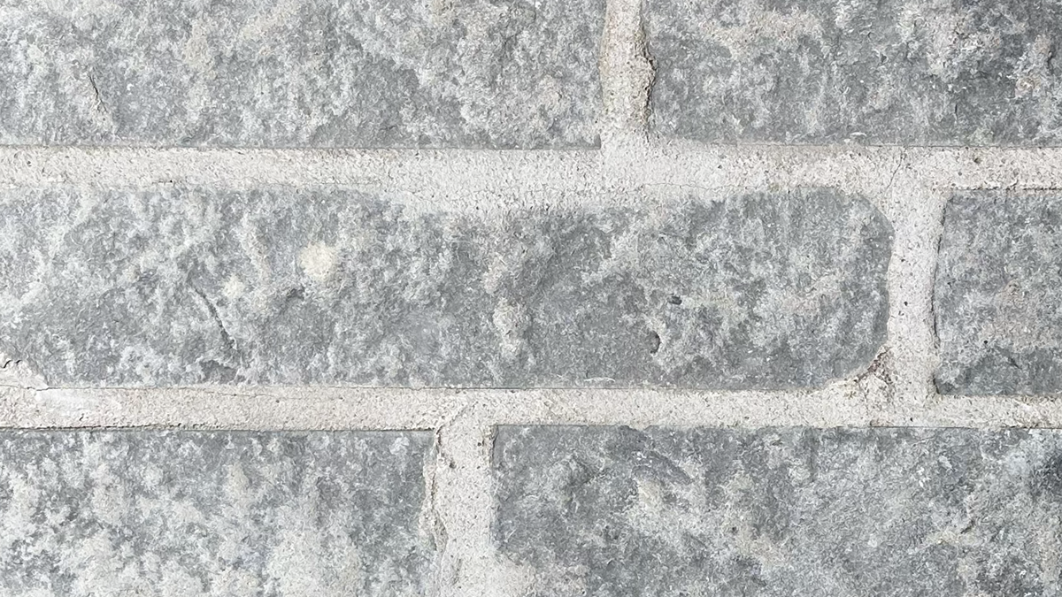 Natural Stone Thin VeneerMaya Neo Ledge: Split with Overgrout features rectangular stones in a cool, bluish-gray hue with varied mineral mottling. The split-face texture is coarse and rugged, catching light unevenly across each block. Overgrout gives the pattern a solid, continuous feel.