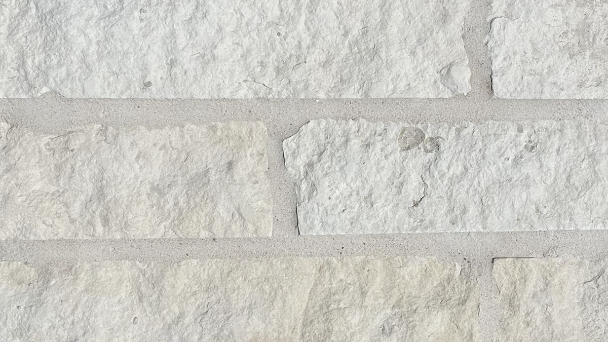 Natural Stone Thin VeneerStella Neo Ledge: Split with Overgrout displays linear blocks in a frosty white tone with cool undertones. The split-face texture is irregular but finely detailed, giving the surface a grainy, crystalline feel. Overgrout is neatly applied, filling the joints and creating a clean, connected layout.