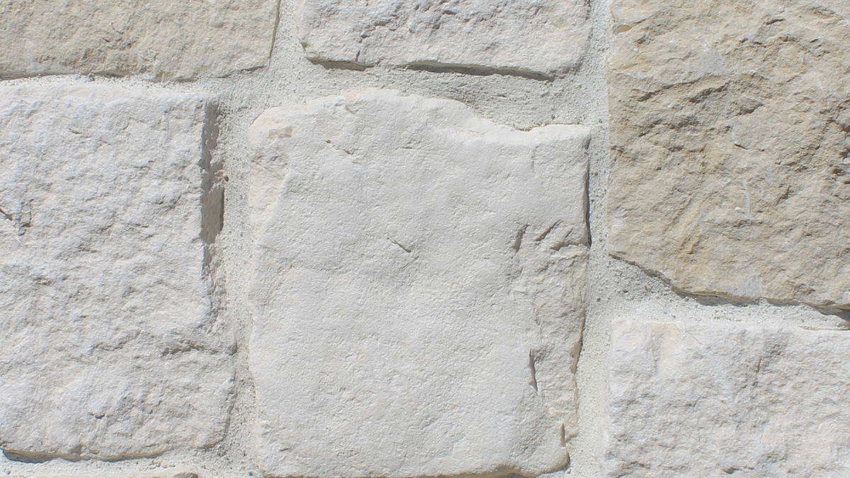 Casa Blanca Rubble with Mortar Wash features soft whites and muted creams with occasional sandy accents. The stone shapes are blocky and irregular, with gently rounded edges and a timeworn surface. Mortar is applied liberally, creating a hazy transition between stones.