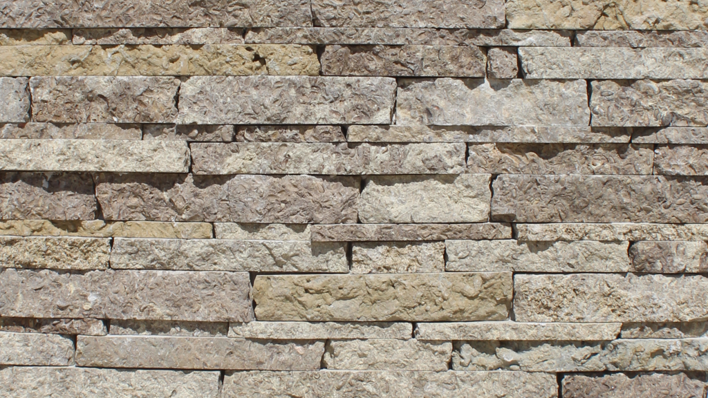 Cambriana West Avalon Ledge has varied shades of tan, brown, and light gray give the stone a mottled appearance. The pieces are linear and horizontally arranged with rough-hewn faces. Edges are irregular, with occasional gaps and shadows between stones to show dimension.
